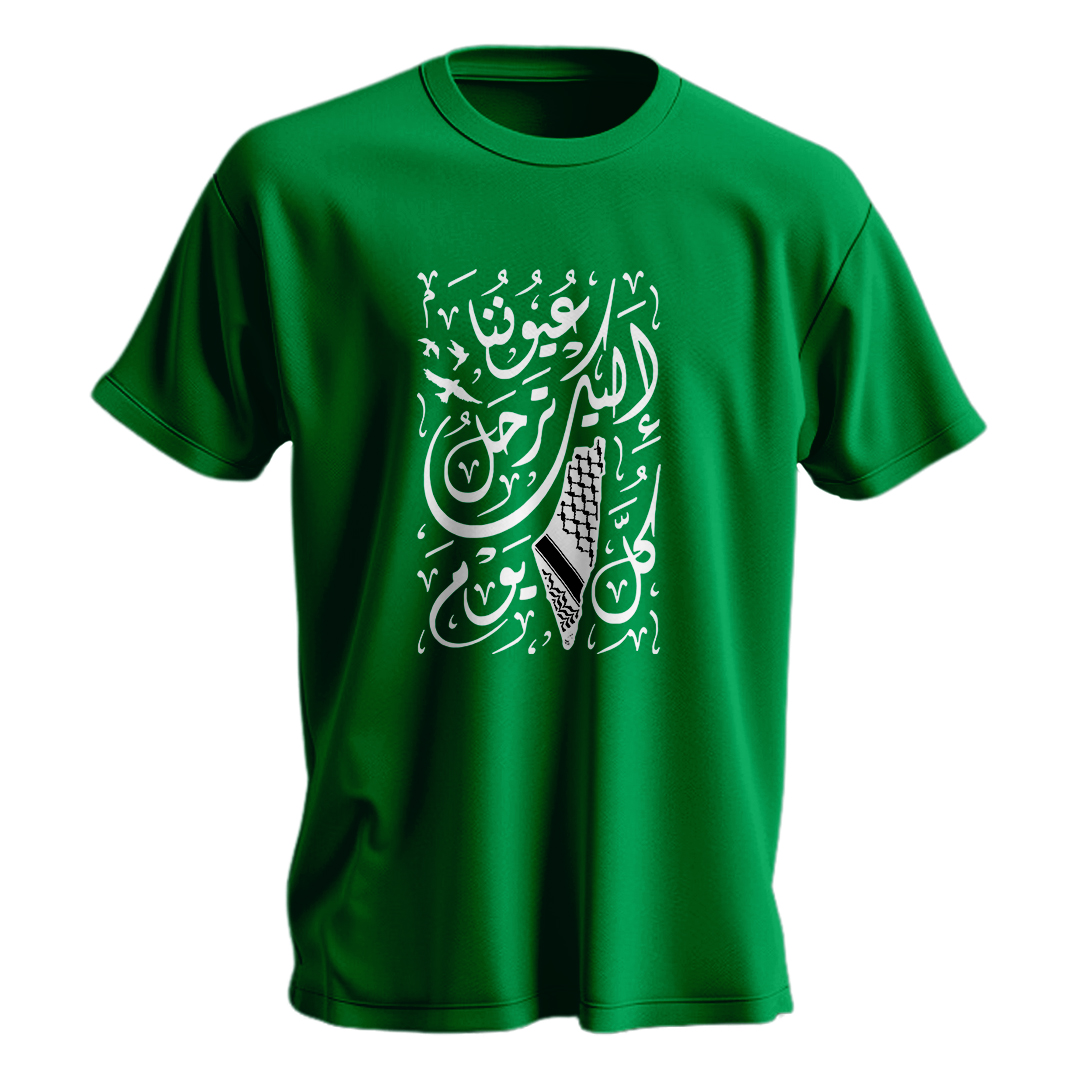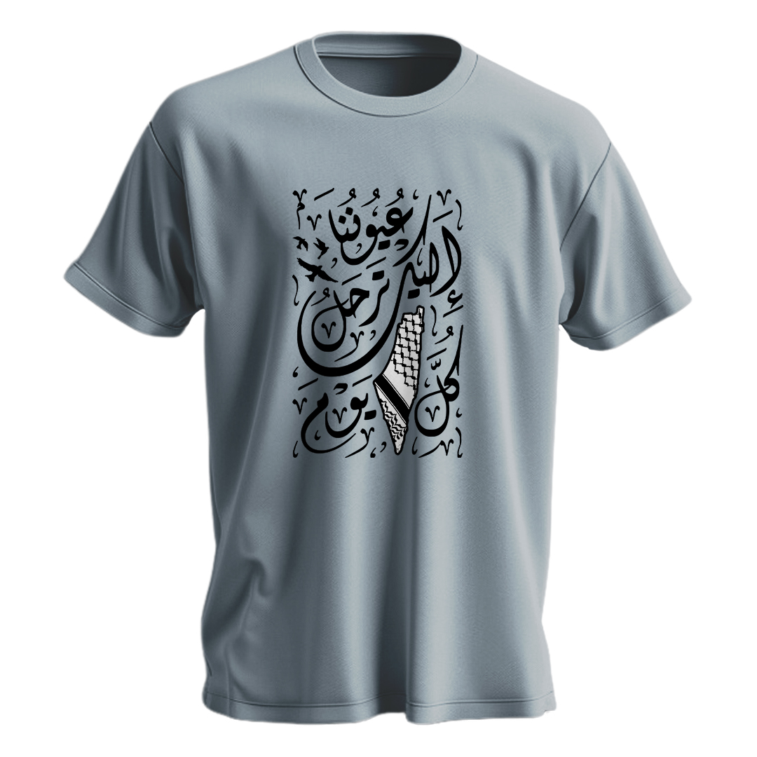 تیشرت مردانه یقه گرد اسکرین شاپ با طراحی ساده خود گزینه‌ای مناسب برای استایل های روزمره و اسپرت است. آستین های این تیشرت کمی بلندتر از حالت معمول بوده و تا نزدیکی آرنج قرار می‌گیرند. متن “عیوننا الیک ترحیل” روی تیشرت به معنای “چشمان ما به سوی تو در حرکت است” بیانگر همبستگی و امیدی است که در فرهنگ مقاومت جایگاه ویژه‌ای دارد. جنس این تیشرت نخ پنبه بوده و همین موضوع باعث نرمی، راحتی و تنفس پذیری بالای پارچه می‌شود. تیشرت مردانه اسکرین شاپ با دوخت استاندارد و کیفیت بالای پارچه انتخابی مناسب برای ست کردن با انواع شلوار جین یا کتان خواهد بود.